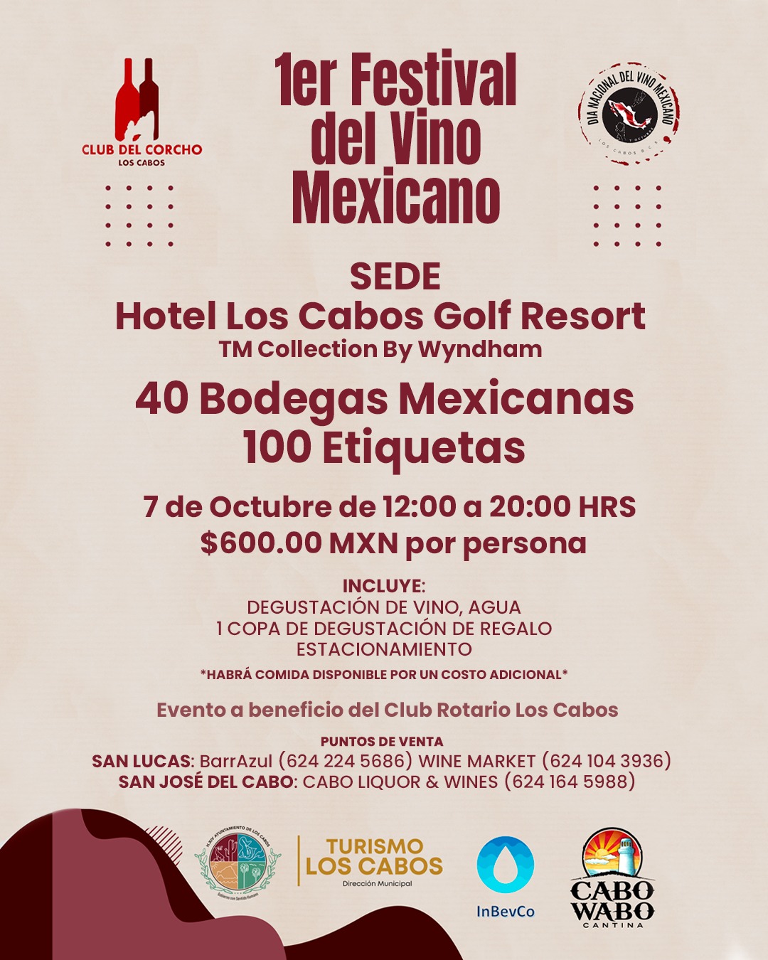 En conmemoración del día del vino mexicano, el próximo 7 de octubre, de 12: 00 pm a 20:00 pm, se realizará el primer festival de vino mexicano en Los Cabos, en el hotel Los Cabos Golf Resort, Trademark Collection by Wyndham. Además será un evento que beneficiará a los programas de educación y apoyo a jóvenes y familias de Club Rotario Los Cabos.