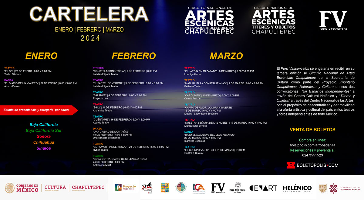 Disfruta de 33 funciones entre los meses de enero, febrero y marzo. ¡en el único espacio profesional dedicado a las artes escénicas en Cabo San Lucas!