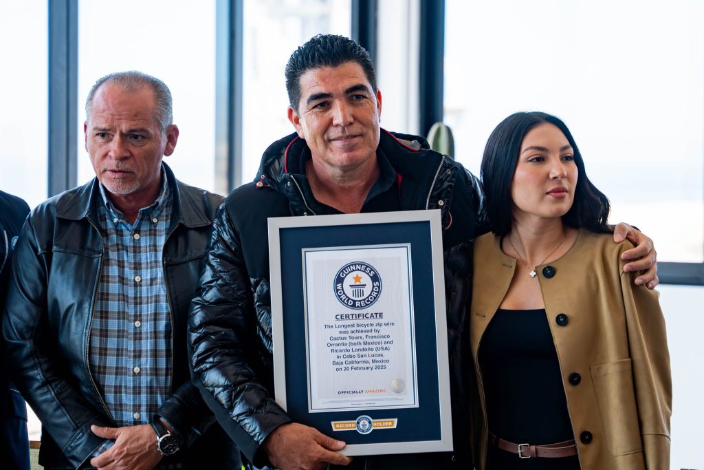 “Nos reunimos aquí para presentar el zip line de bicicletas más largo del mundo. Un proyecto que representa innovación, aventura y, sobre todo, un gran orgullo para Los Cabos. Este día no solo es significativo para Cactus Tours, una empresa cabeña que desde su fundación en 2007 se ha dedicado a innovar y a expandir su oferta de actividades de aventura al aire libre. Hoy Los Cabos entra en los libros de historia, no se trata solo de una marca que se registra y se guarda en una lista; este récord es una experiencia viva que la gente podrá sentir, disfrutar y recordar para siempre. Es una hazaña que no solo pone a Los Cabos en la mira del mundo, sino que también nos permite ofrecer a los visitantes una aventura sin precedentes, una razón más para elegir este destino sobre cualquier otro. Quiero agradecer a todas las personas que hicieron posible este sueño”, comentó Francisco Orrantía.