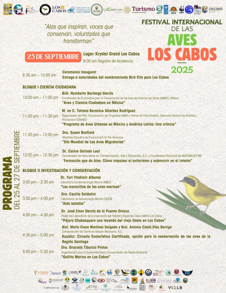 En la rueda de prensa llevada a cabo en las oficinas de FITURCA el día 19 de septiembre del 2025 se presentó el Primer Festival Internacional de las Aves Los Cabos 2025, un esfuerzo intersectorial que reúne a gobierno, academia, iniciativa privada y sociedad civil para impulsar el aviturismo como motor de conservación, educación y desarrollo local. Los voceros destacaron que el festival coincide con el Día Mundial del Turismo que se celebra el 27 de septiembre. El lema que se eligió fue: Alas que inspiran, voces que conservan, voluntades que transforman para el festival: Turismo y Transformación Sostenible”, subrayando la oportunidad de diversificar la oferta turística e integrar a las comunidades rurales del municipio.