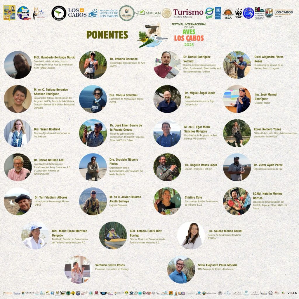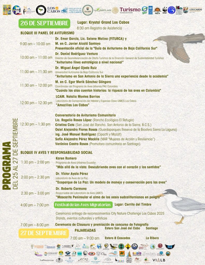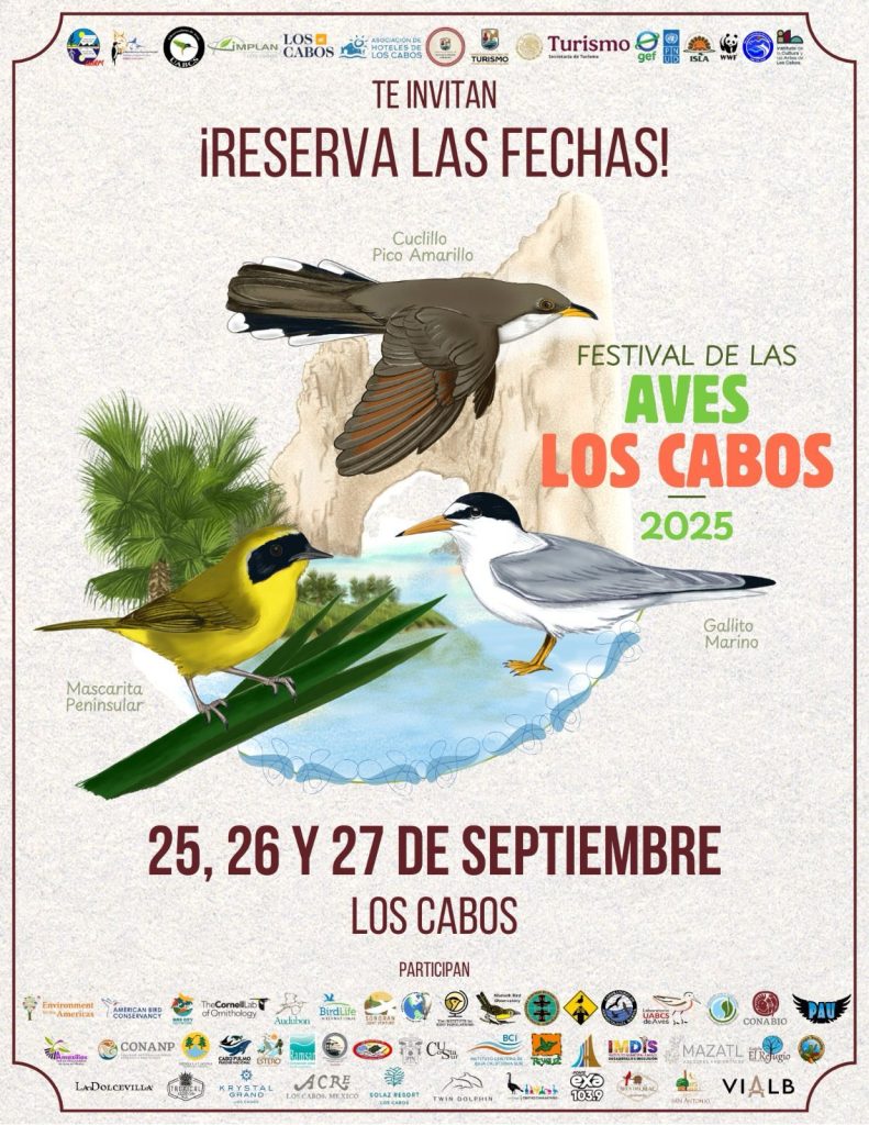 - Pajareadas (jornadas de observación de aves) en cuatro sitios emblemáticos: Cabo San Lucas (zona de mezquital), Estero de San José del Cabo, Oasis de Santiago y Estero del Surgidero (La Ribera).