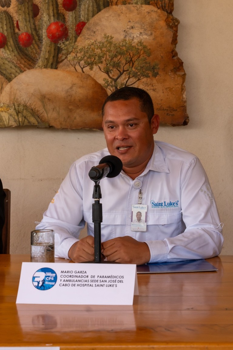 Desde el presidium, Mario Garza, coordinador de paramédicos y ambulancias de Saint Luke’s en San José del Cabo, detalló el operativo de salud: