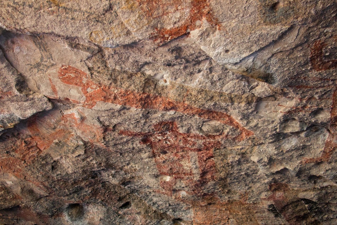 Las escenas están ejecutadas en tonos ocres, rojos, blancos, amarillos y negros. Las figuras humanas en rojo y negro, con los brazos en alto y raros tocados. En muchos casos, estas figuras y las de los animales como liebres, ballenas, serpientes y aves, aparecen sobrepuestas, lo que podría significar que se realizaron en diferentes épocas.